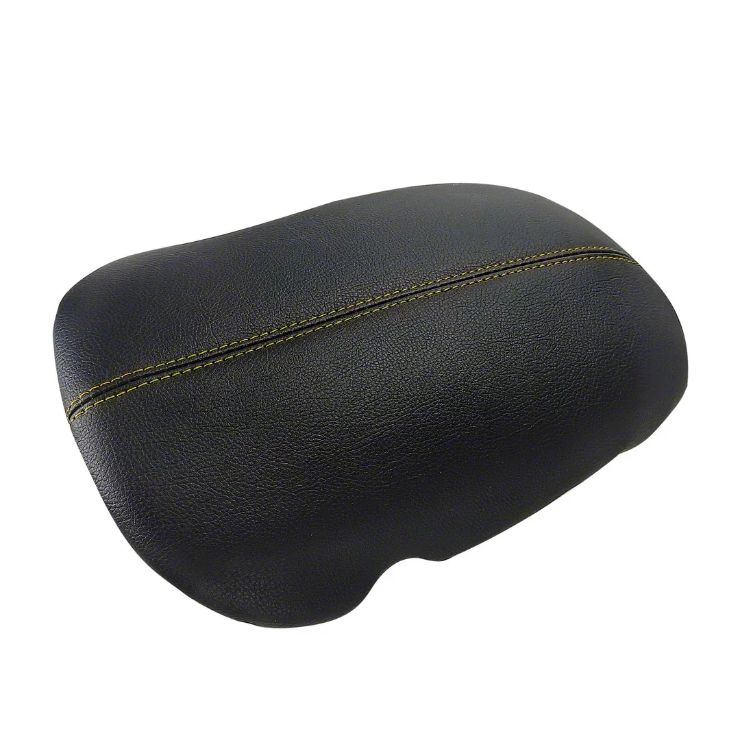 Stylish Interior Enhancement. The Premium Artificial Leather Center Console Lid Armrest Cover adds a refined touch to your Mustang's interior while offering added comfort and protection. Designed to fit snugly over the existing center console lid, this cover improves the look and feel of your cabin with its sleek black finish and bold yellow stitching. It's an ideal upgrade for worn lids or anyone seeking a custom interior accent.