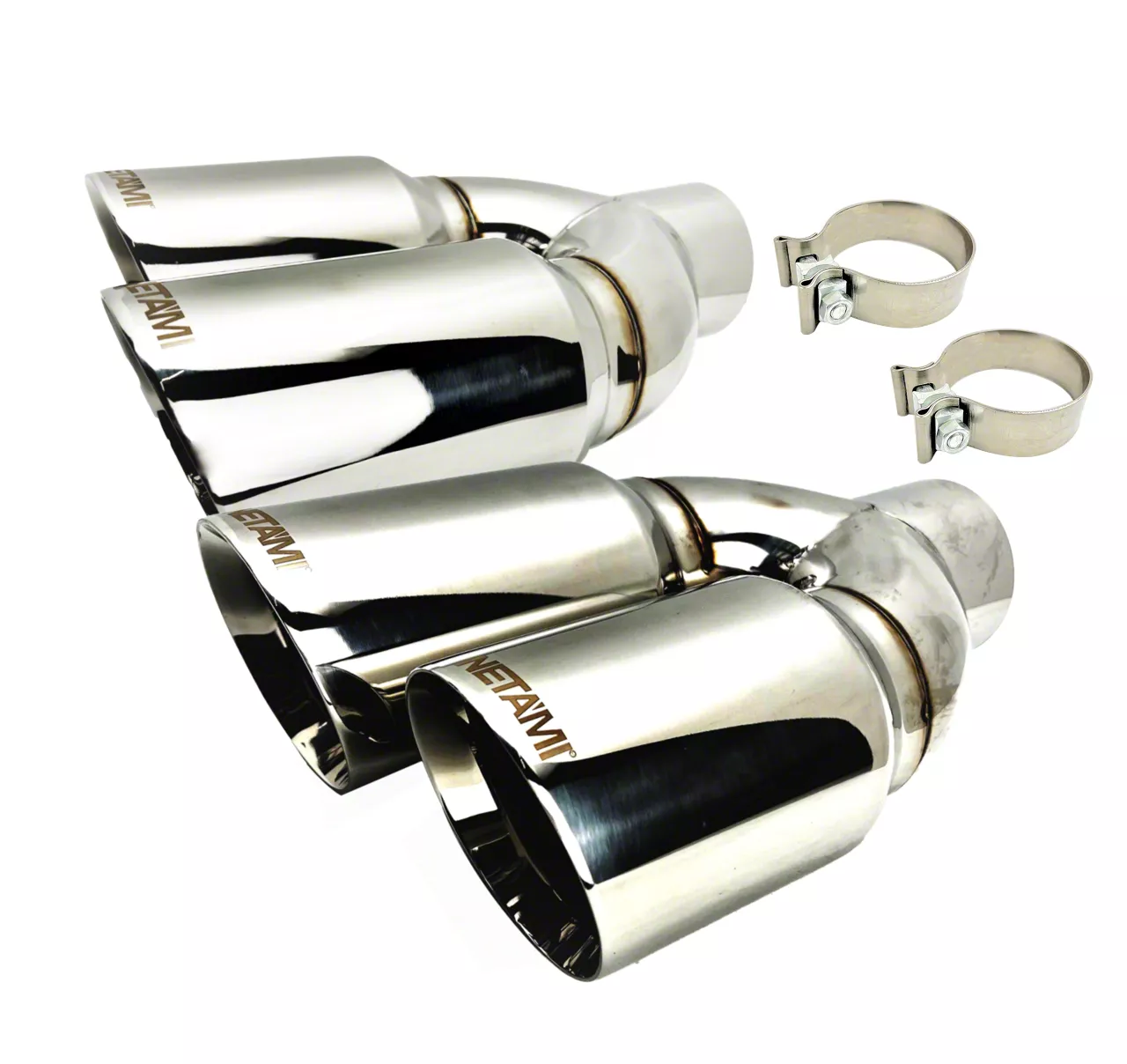 Aggressive Exhaust Style. The Quad Staggered Slant Cut Exhaust Tips give your vehicle a bold, performance-inspired look with four polished outlets. Designed to fit a 3-inch tailpipe, these tips enhance your exhaust's appearance with a staggered, slant-cut layout that emphasizes an aggressive stance. Perfect for performance enthusiasts, they add both style and presence to your ride.