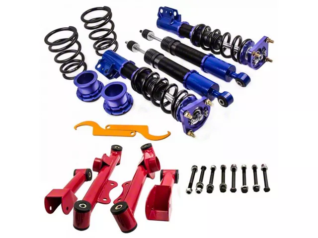 Installation. As a direct replacement system, this kit includes coilover struts, shocks, coil springs, spring perches, rear control arms, and the necessary hardware. Professional installation is recommended since no installation instructions are included, ensuring correct setup of adjustable dampers and camber plates for optimal performance.