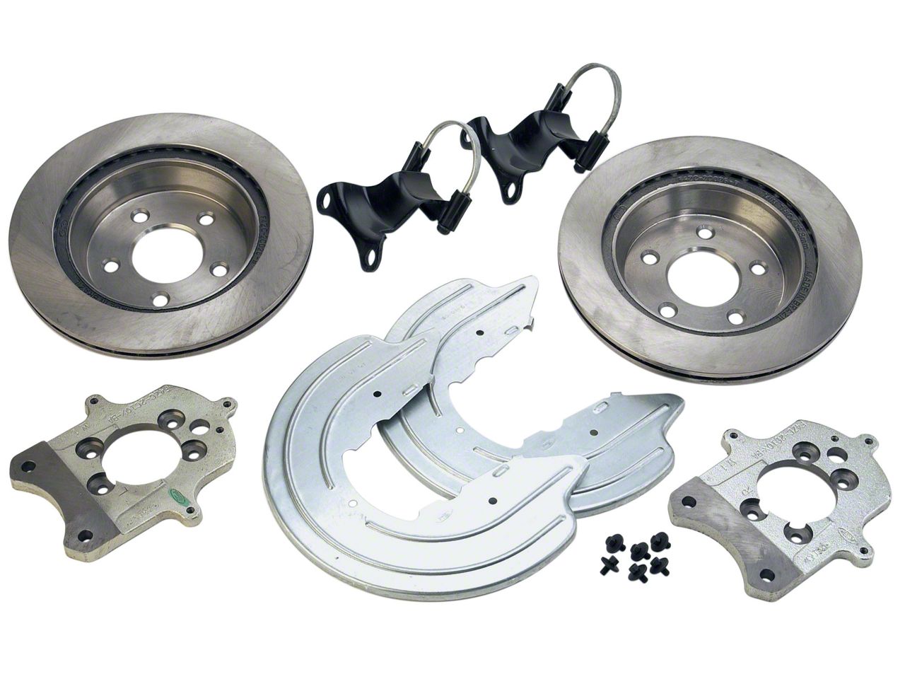 Kit Includes. This rear brake bracket kit includes the caliper mounting brackets, braces, dust shields, dust shield bolts, and two blank 11.65" rear rotors. Everything you need to install rear Cobra calipers on your Pony with no need to make a trip to the Ford Parts Department.