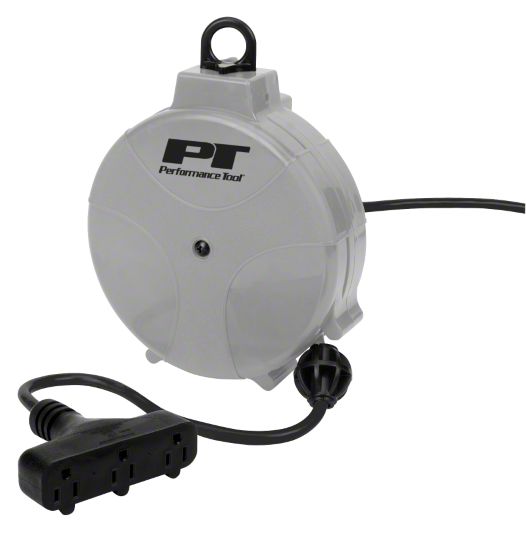 Description. Cord Reel; Retractable; 20 Foot Cord; 18-Gauge; Black; Three 8 Amp Outlets; Impact-Resistant Housing
