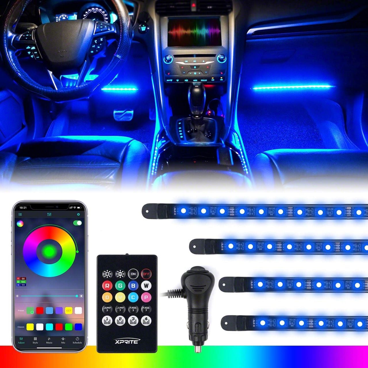 Xprite car interior light strips feature high-intensity 3 In 1 RGB chips that offer a brighter output with vibrant colors. Silicone-sealed ends keep LEDs protected. More durable with a longer lifespan, over 50,000 hours. Flexible strips allow for a customized install and display, for a cool light show inside of your ride.