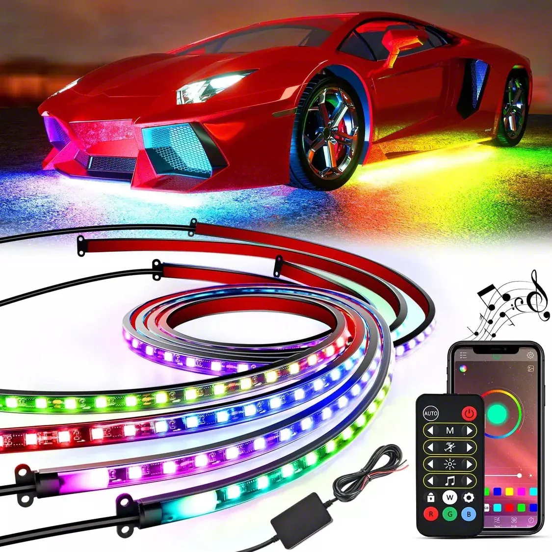 Smart App and Remote Control Functionality. The RGBIC Underglow Neon LED Strip Lights; 4-Piece include both wireless remote and smartphone app control for easy customization. Using the app, you can select from millions of color combinations, adjust brightness, set dynamic effects, or synchronize lighting with music for a personalized, immersive experience. The intuitive interface allows instant color changes and effect adjustments from the palm of your hand.