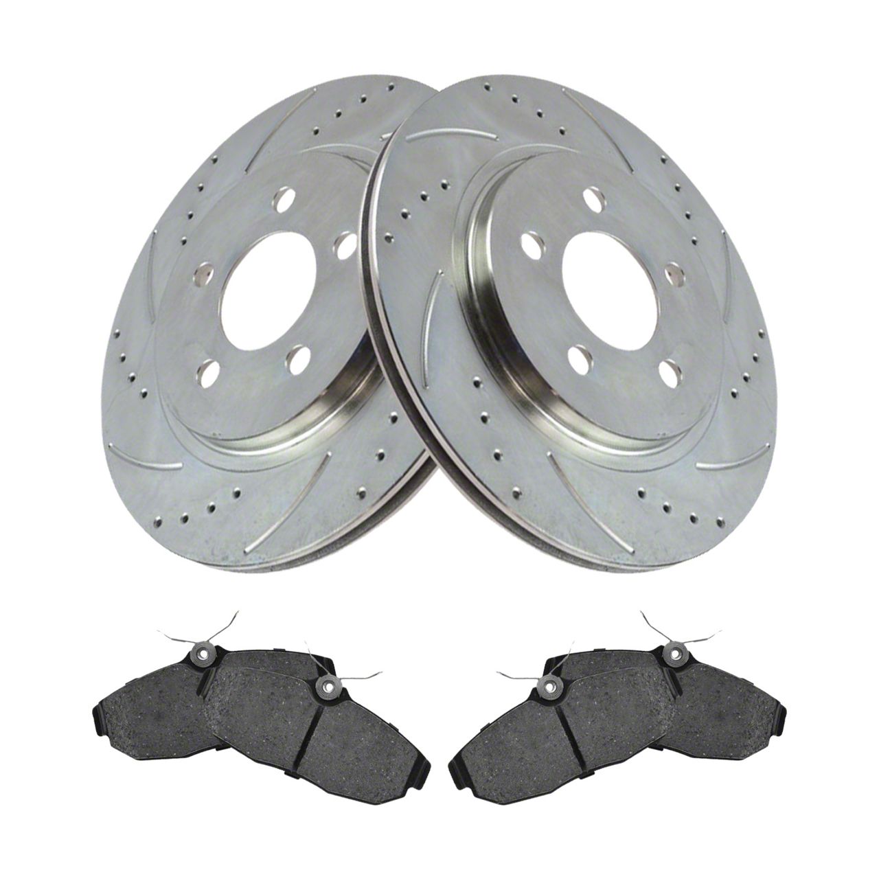 Construction and Appearance. Manufactured from premium-grade cast iron rotor material, this kit features a 1-piece rotor construction with a vented, drilled, and slotted style. Integrated with semi-metallic friction material and constructed with premium posi brake pad bonding, it boasts a corrosion- and rust-resistant composition with a premium G-coated brake rotor coating.