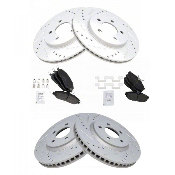 G-Coated Surface. Designed for all 2005-2010 Ford Mustang GT and 2011-2014 Ford Mustang V6 models, this kit serves as a direct replacement for malfunctioning components. It features a G-Coated Drilled and Slotted Rotor Style for enhanced braking efficiency and heat dissipation. Crafted to meet or exceed industry safety and quality standards, the kit promises durability and reliability.