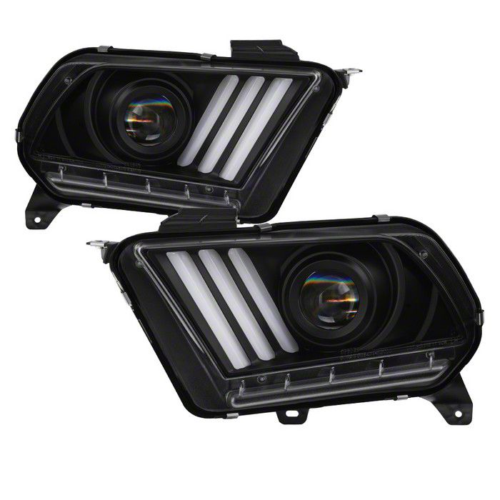 Application. These Signature Series Sequential Light Bar Projector Headlights; Black Housing; Clear Lens fit all 2010 to 2012 Ford Mustang GT and V6 models with HID headlights.