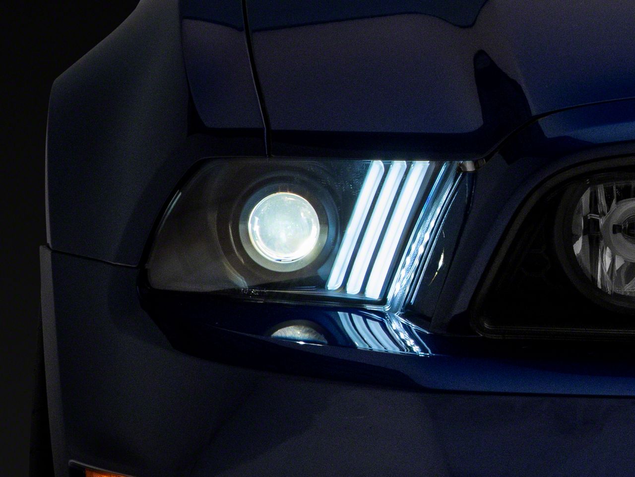 Intimidating Styling. Give your 2013-2014 Mustang an intimidating new look with the Mustang Signature Series Sequential Light Bar Projector Headlights. These Projector Headlights use a black housing with a clear projector-style lens to evoke an aggressive look. Not only do the lights look great on the late model year S-197 Mustangs, but the Sequential Turn Signals are eye-catching and a throwback to the Mustangs of old.