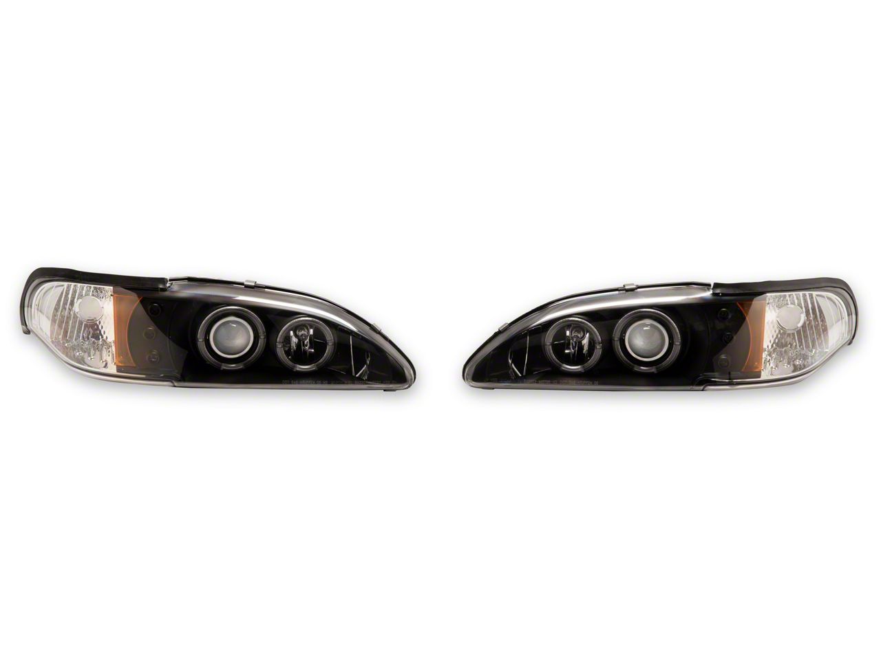 Affordable and Stylish Upgrade. Mustang’s Signature Series LED Halo Projector Headlights offer a stylish upgrade over your factory headlights without the need for an expensive upgrade or install. Halo projector cluster headlights come with a clear lens and black housing for a polished finish that will match any Mustang color or model between 94-98.