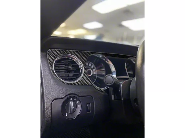 Modern Industrial Look. Give your Mustang's upholstery a unique modern design with this Speedo Accent Trim; Domed Carbon Fiber. You may now customize your vehicle's upholstery without fear of a spill or nick forever damaging the speedometer housing. This sturdy and appealing Accent Trim Set is made up of a glossy Ultraviolet protection epoxy on top, genuine carbon fiber beneath, and a 3M underlayer.