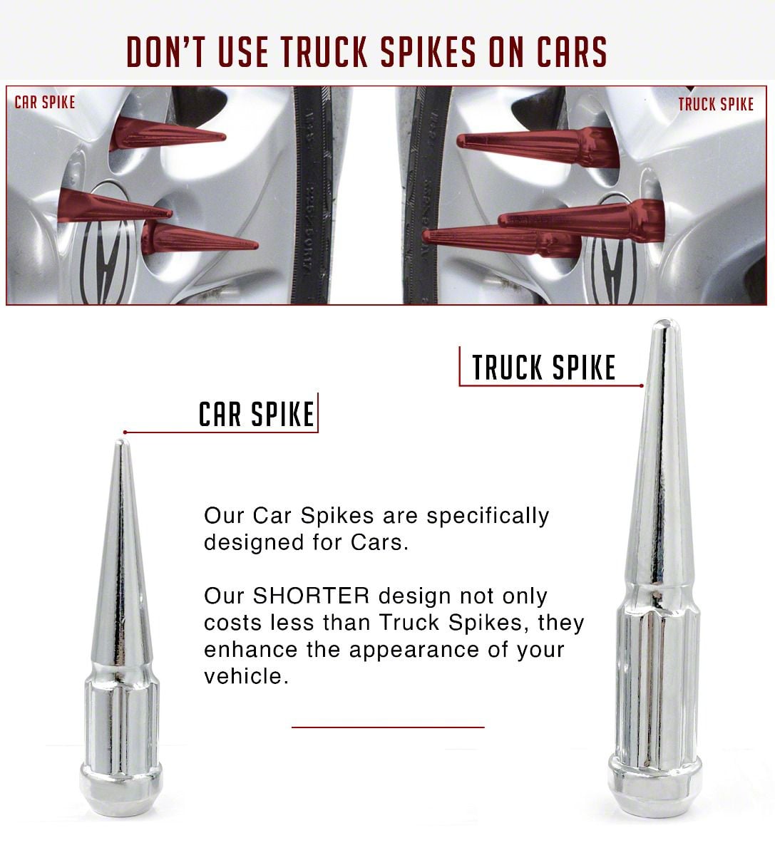 Enhance Your Mustang’s Wheels with Durable and Stylish Lug Nuts. The Spline Spike Chrome Lug Nut Kit adds a striking and aggressive touch to your Mustang’s wheels while providing enhanced security. The unique spike design not only elevates aesthetics but also prevents unauthorized removal.