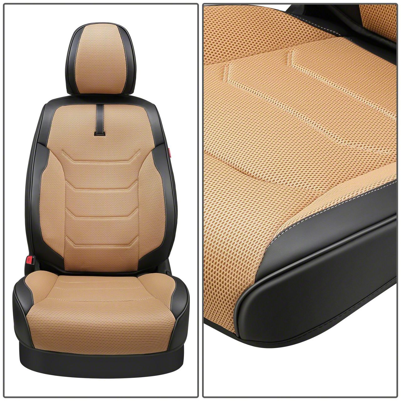Durable Seat Protection. The Sport Series Front Seat Covers; Beige/Black provide effective protection for your vehicle's upholstery while enhancing comfort and visual appeal. Designed for front bucket seats and Captain's chairs, these covers shield your factory seats from wear and tear, helping maintain their condition and value. Easy to use, they add style and long-lasting durability to your vehicle interior.