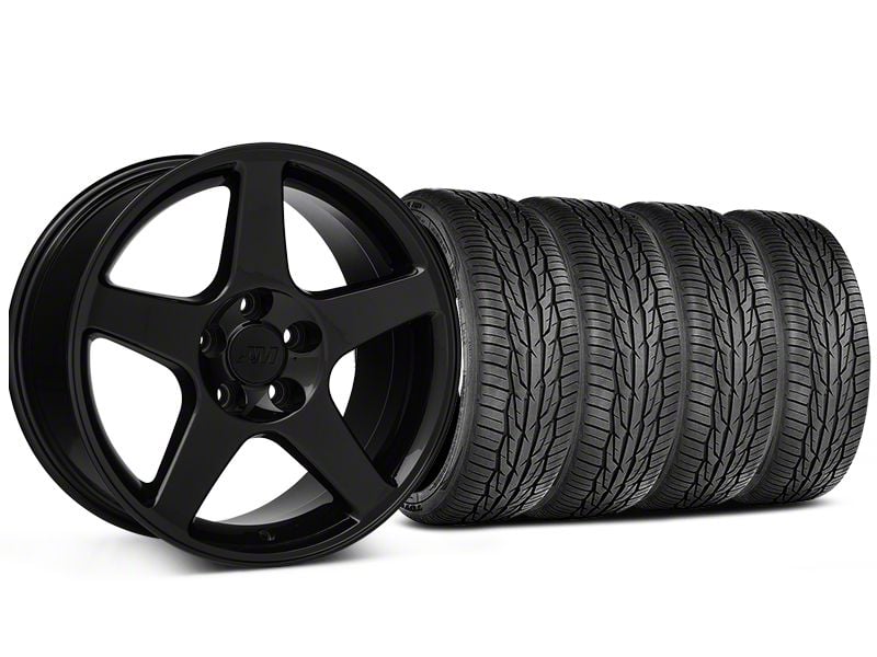 Easy, One Stop Shopping. This staggered combo kit features (2) 17x9 and (2) 17x10.5 2003 Cobra Style Black Wheels with (2) 275/40R17 and (2) 315/35R17 Toyo Extensa HP II All-Season Tires. This popular Wheel and Tire Kit has been created for the exact specifications of your 1999-2004 Ford Mustang for a guaranteed perfect fit with no rubbing or clearance issues.