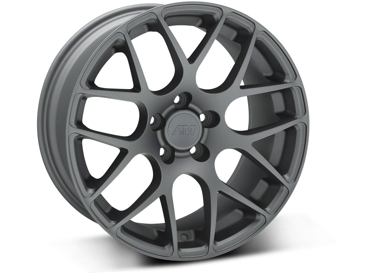 Charcoal AMR Wheel. Add aggressive drift car styling to your powerful Pony with a set of AMR wheels. The AMR style wheel is the perfect addition to any late model Mustang with its bold drift car inspired multi spoke design. Completed in a dark charcoal hue that is lighter than the standard "Henry Ford" black, these wheels feature a modern matte finish for a stealthy appearance, with the added benefit of never noticing brake dust.