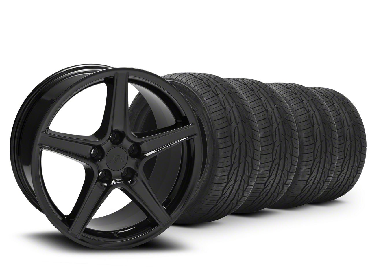 Easy, One Stop Shopping. This staggered combo kit features (2) 19x8.5 and (2) 19x10 Black Saleen Style Wheels with (2) 245/45R19 and (2) 275/40R19 Toyo Extensa HP II All-Season Tires. This popular Wheel and Tire Kit has been created for the exact specifications of your Ford Mustang for a guaranteed perfect fit with no rubbing or clearance issues.