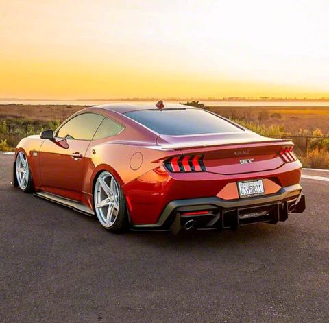 Aggressive Styling and Aerodynamic Performance. The Stealth Diffuser is designed specifically for 2024-2026 Ford Mustang GT models without active exhaust and EcoBoost models without active exhaust, providing an aerodynamic enhancement that improves airflow and adds an aggressive track-inspired appearance. This full 3-piece diffuser helps reduce drag and increase rear-end stability at high speeds.