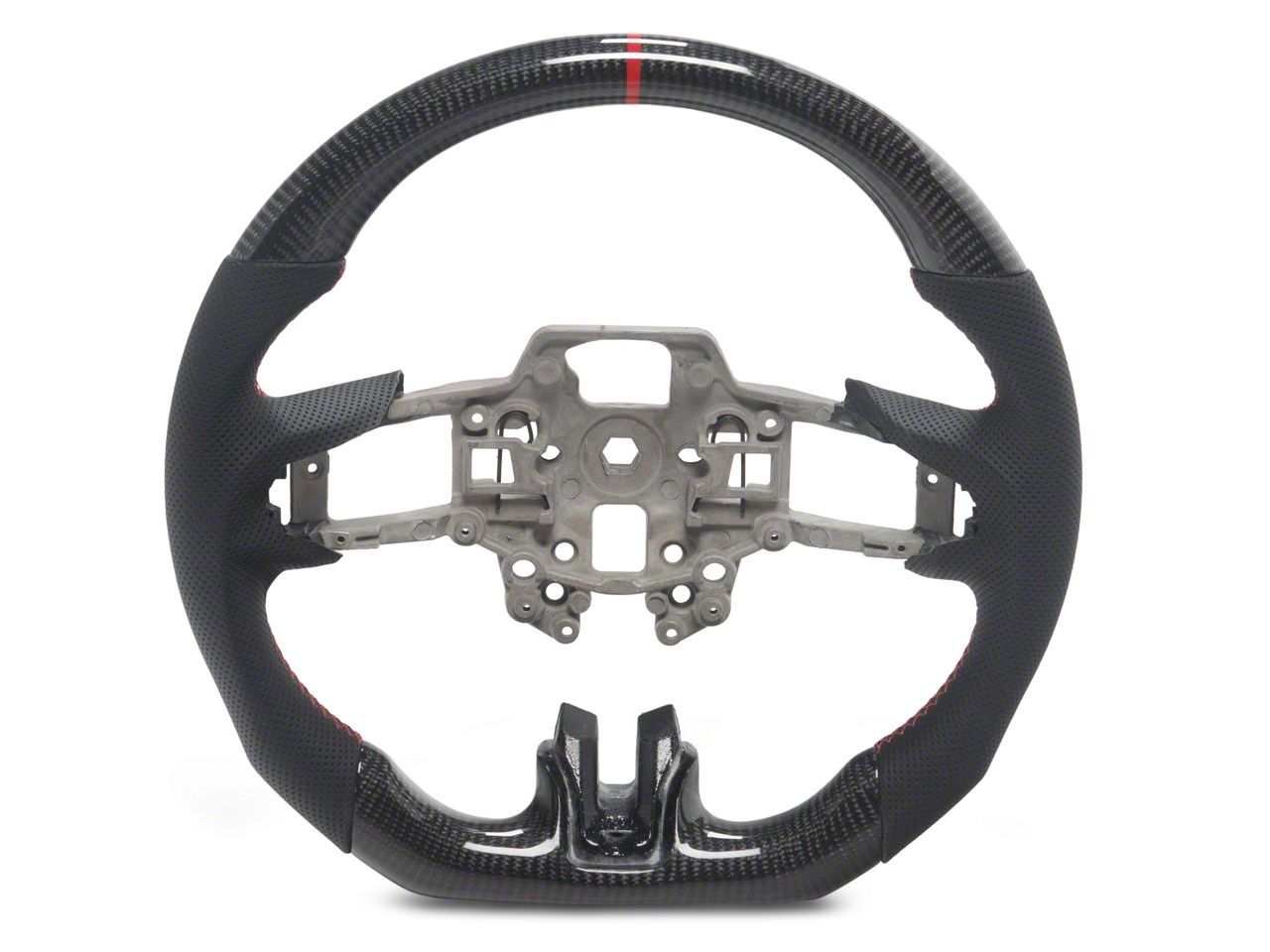 Construction and Appearance. Crafted from top-grade Carbon Fiber with Red Stripe materials, this steering wheel boasts a durable and luxurious feel. What's more? The red stripe adds a striking visual element, while the symmetrical design and pre-cut measurements ensure a perfect fit.