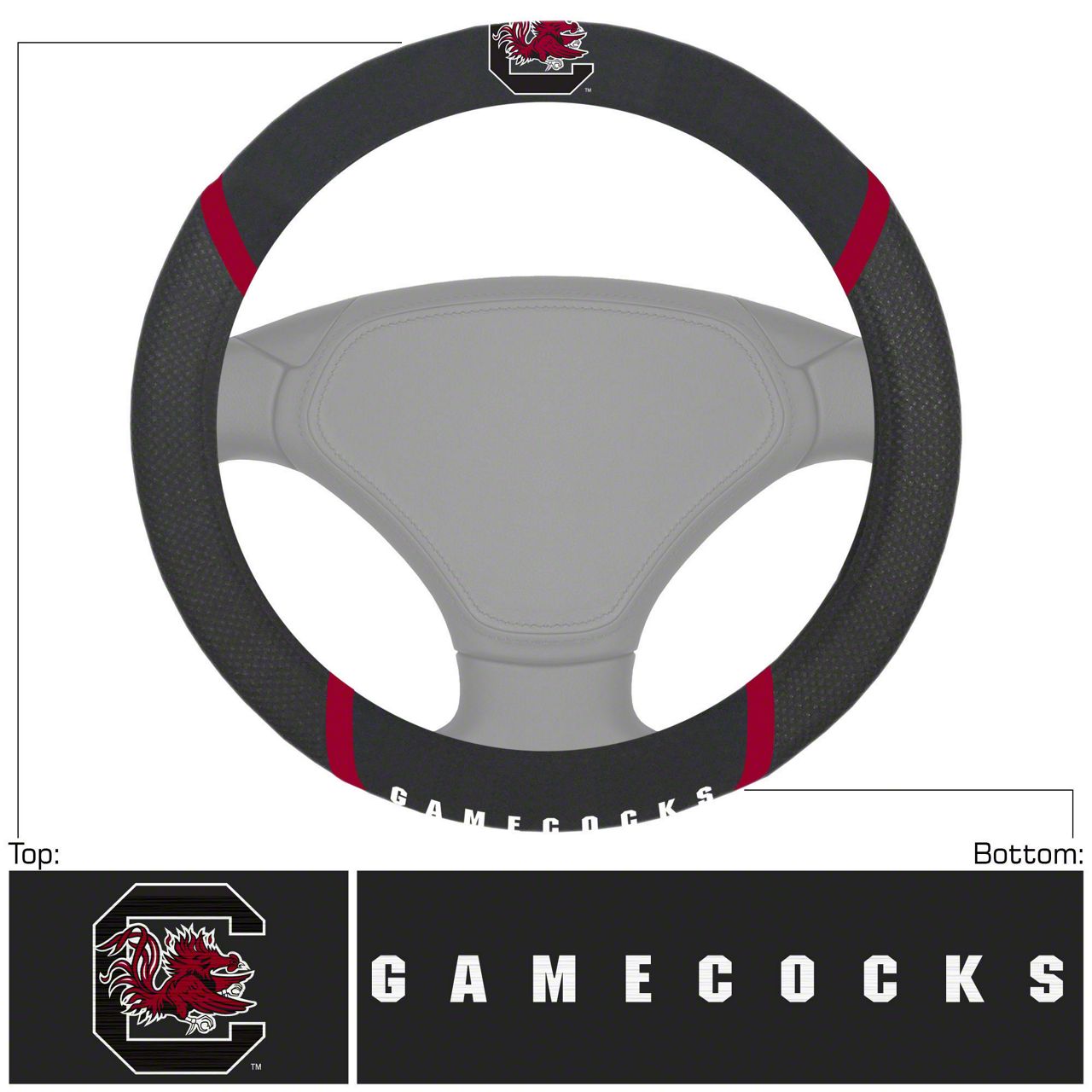 Application. This Steering Wheel Cover with University of South Carolina Logo (Black) fits most vehicles with standard steering wheel dimensions (approximately 15 inches).