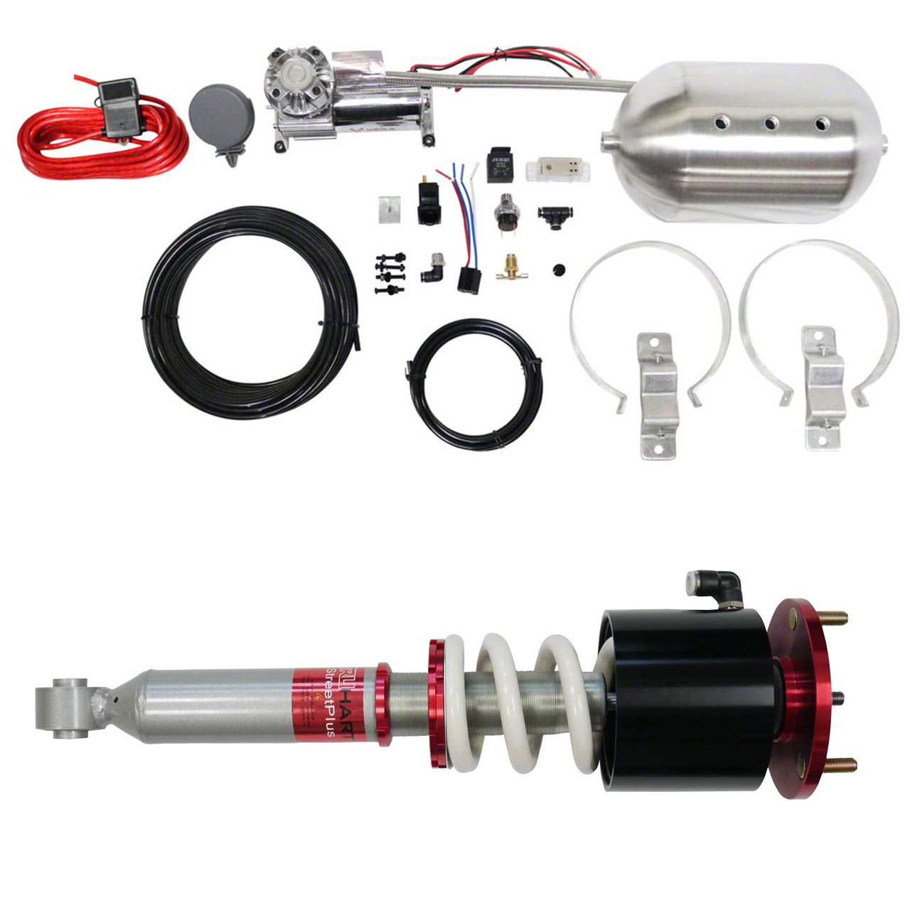 On Demand Height Adjustment. Made for the Ford Mustang GT and V6 models, this Coil-Over Kit comes in a polished chrome finish. Built to give your ride an on demand height adjustment with a front and rear drop of up to 2 inches, this coil-over kit includes 2 front air cups, a Vera 100c Compressor, a pneumatic valve, and a silver control system.