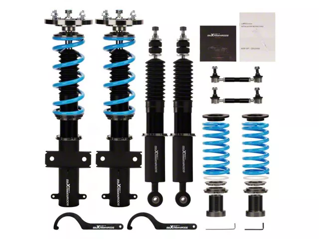 Construction and Appearance. Featuring a bold matte black and glossy blue finish, this kit combines aggressive aesthetics with high-performance function. Built with quality materials, each coilover and shock is engineered for durability under demanding driving conditions, while the threaded spring perches allow accurate height adjustments from 1 to 3 inches.
