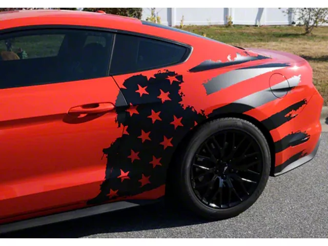 Patriotic Design. Made for the Ford Mustang, this Tattered American Flag Body Graphic comes in a glossy black finish and is crafted from high-quality vinyl. Built for 8-years of outdoor use, this graphic has a patriotic design that celebrates and honors the Stars and Stripes.