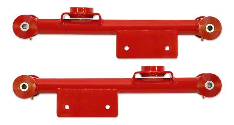 Enhanced Suspension Performance. The Tubular Rear Lower Control Arms with Polyurethane Bushings; Gloss Black improve suspension rigidity and reduce flex compared to factory components. These arms help reduce wheel hop and increase traction, providing a better driving experience for Mustang owners. They are designed for straightforward replacement to enhance vehicle performance.
