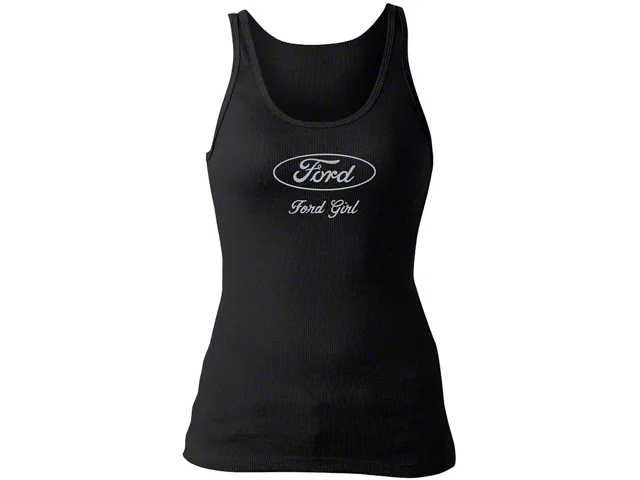 Ford Themed Graphic Tank Top. This great looking black tank top is a must have for all Ford enthusiasts. Officially licensed, this graphic tank top features the Ford Oval logo with "Ford Girl" in text below. This Tank Top makes the perfect gift for yourself or the fellow Ford lover in your life.