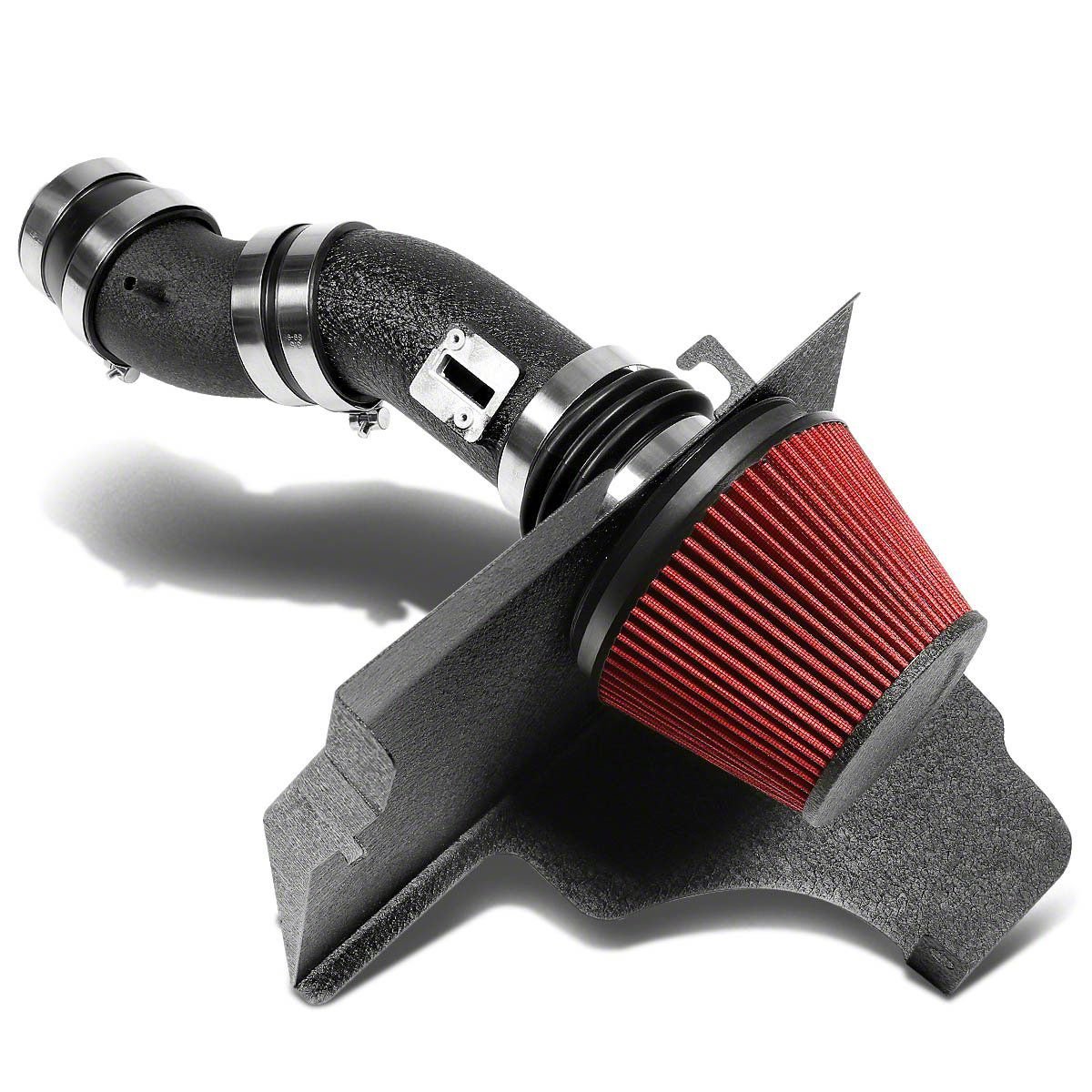 Increased System Airflow. Boost your car performance, and get more out of your system with this Aluminum Cold Air Intake with Red Filter and Heat Shield; Black on your Mustang. Precision machined, this assembly features a tough build that offers optimal air pathways and high intake volume to improve fuel burn and give your more mileage per liter.