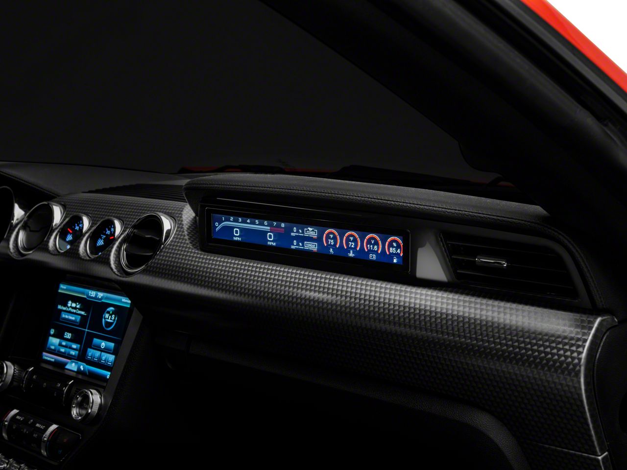 Passenger Side Gauge Panel. Now your passengers can see exactly what you see with the Navos Passenger Side LCD Gauge Panel Display. By interfacing with your vehicle's Canbus system, this full color LCD Display will keep a close eye on all of your Mustang's critical engine parameters.