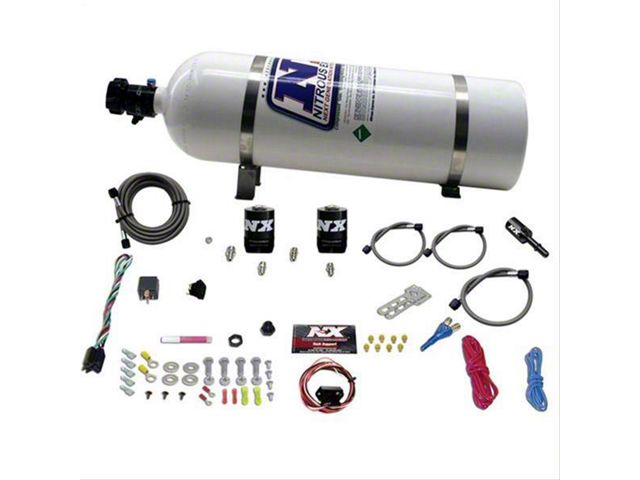 Description. Nitrous Express has combined performance, quality and easy installation in this new nitrous system engineered specifically for the 2011 Ford 5.0 Coyote engine. This system includes an Autolearn TPS switch which allows the nitrous to activate only at wide open throttle. A direct-plug-in Fuel Line Adapter is provided to simplify installation (no need to cut your factory fuel lines). The system includes the billet aluminum and carbon fiber Lightning series solenoids, the patented Shark nozzle, a nozzle mounting adapter, a 15lb nitrous bottle with the new billet aluminum Lightning 45 bottle valve, extra long stainless braided N2O line, stainless bottle brackets, master arming switch, relay, relay harness and all necessary hardware to complete the installation. Includes jetting for 35, 50, 75, 100, 125 and 150HP. The system can be easily upgraded to power levels up to 250 wheel horsepower! Fits 2011 Ford GT Mustangs with the 5.0L 4 valve coyote engine.