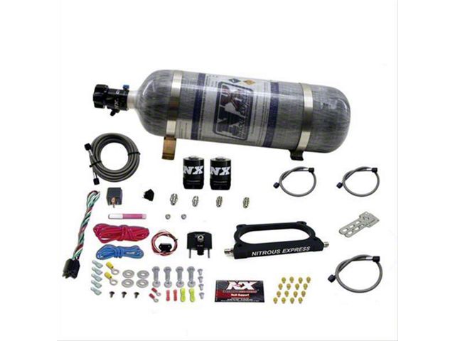 Description. The Nitrous Express GT500 Nitrous Plate System features a billet nitrous plate that fits behind the throttle body making installation quick, simple, and attractive.? The system includes aluminum and carbon fiber solenoids, for ultimate performance and weight savings.? The system includes a NX fuel rail adapter for simple fuel system hook-ups (no need to cut factory fuel lines), TPS wide open throttle switch, 15 foot nitrous feed line, master arming switch, relay, relay harness and all necessary hardware to complete installation.? System comes with jetting from 35hp-300hp.? System can be purchased with 5, 10 or 15lb bottle, all of which include the Billet aluminum Lightning 45 bottle valve. Fits 2007-2014 Shelby GT500 Mustangs.