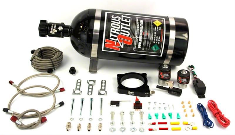 Everything You Need. This plate-style nitrous system comes with everything you need to elevate your Mustang’s power and performance. This includes a 10-pound capacity nitrous bottle, the specialized nitrous plate, two solenoids, and braided steel fuel lines. This system also includes four jets rated for 50, 100, 150, and 200 horsepower.
