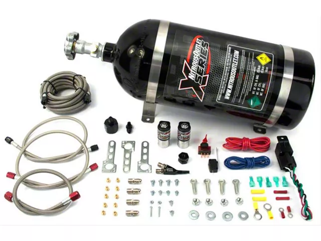 Superior Performance Boost. Set new records with this Nitrous Outlet X-Series Single Nozzle System; 10 lb. Bottle boosting your Mustang. Designed to push your vehicle to its utmost limit, it comes complete with jet assortments that support 50, 100, 150, and 175 HP to blow away the competition. It features strong abrasion resistant braided hose lines while its durable aluminum bottle is leak resistant and contain up to 10 pounds of chemical.