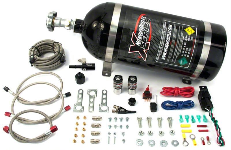 Entry-Level Power Up. This entry-level Nitrous Outlet X-Series Single Nozzle System is made to power up your Mustang. It comes with a 10-pound black powder-coated nitrous bottle, a WOT switch, wiring, steel braided lines, brackets, an activation switch, a variety of nozzles with jets, and all the other installation-related items.