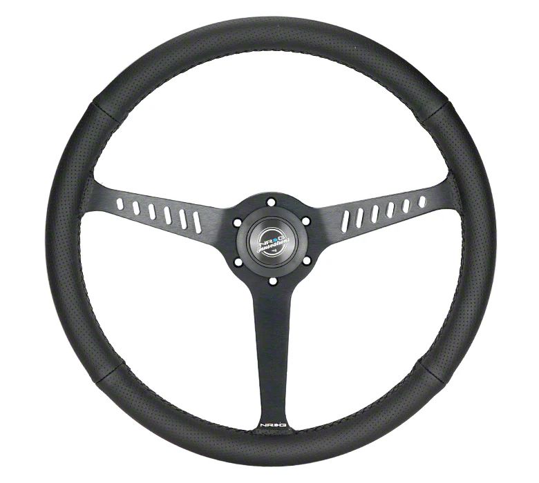 Construction and Appearance. Featuring a perforated leather grip with black stitching, this wheel offers superior comfort and a stealthy appearance. The 3-spoke design incorporates unique cutouts that balance traditional aesthetics with modern edge, all while maintaining the structural integrity required for spirited driving.