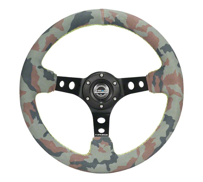 NRG Innovations 350mm 3-Inch Deep Dish Steering Wheel; Camo Suede mark with Black Spoke sand Neon Green Stitching