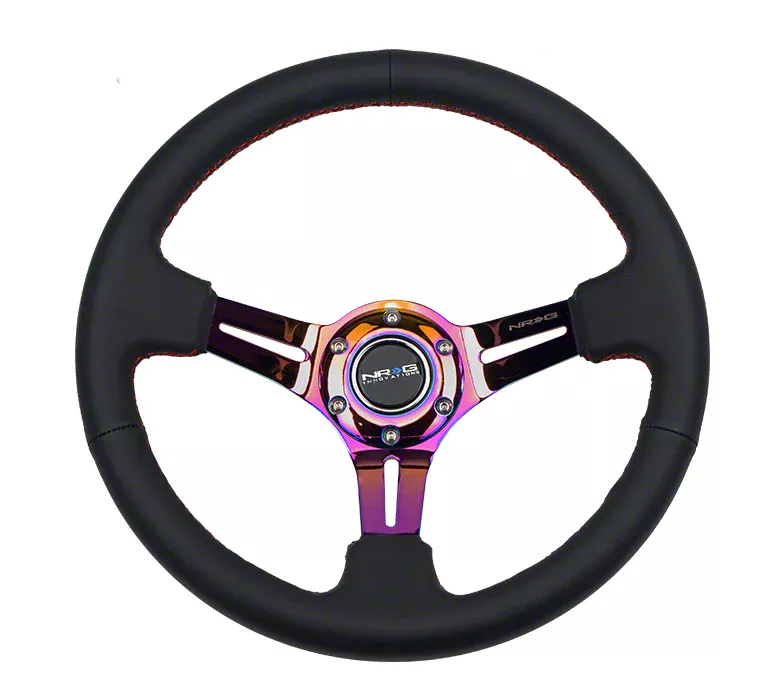 Application. This NRG Innovations 350mm 3-Inch Deep Dish Steering Wheel; Black Leather with Red Stitching and Neochrome Spokes has a universal fitment with some adaptation that may be required.