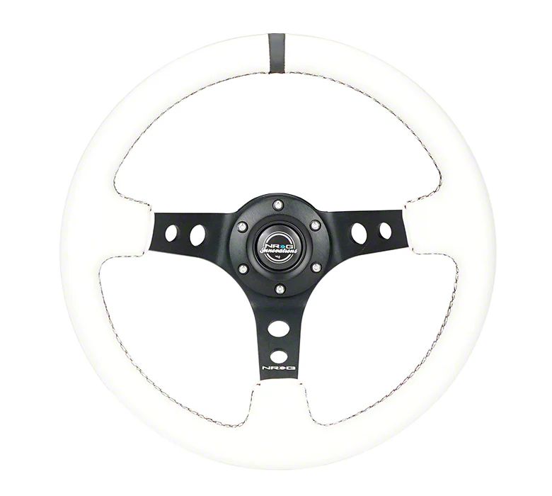 Distinctive Styling. The NRG Innovations 350mm 3-Inch Deep Dish Steering Wheel offers a significant visual upgrade to any vehicle's interior with its striking combination of white leather, contrasting black spokes, and bold white stripes.