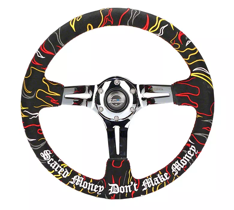Application. This NRG Innovations Ryan Litteral V3 350mm Steering Wheel (Black Alcantara with Chrome Spokes and Red Stitching) fits universal applications with appropriate hub adapters.