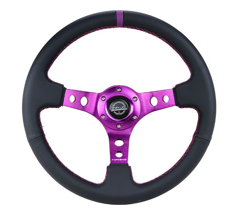 Construction and Appearance. This steering wheel is crafted using high-quality materials, featuring double-rivetted spokes for exceptional strength. The grip area is encased in high-density injection foam for comfort and control, while the Black Leather with Purple Center Mark, Stitching and Center Spoke design gives it a bold and stylish touch.