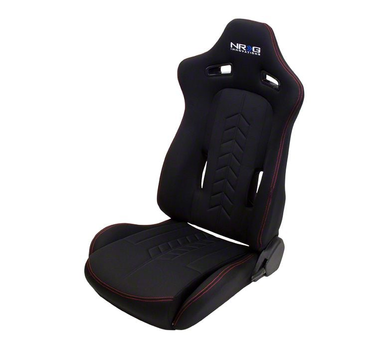 Application. The NRG Innovations The Arrow Reclinable Racing Seats in Black Leather with Red Stitching are designed for universal fitment and may require adaptation.