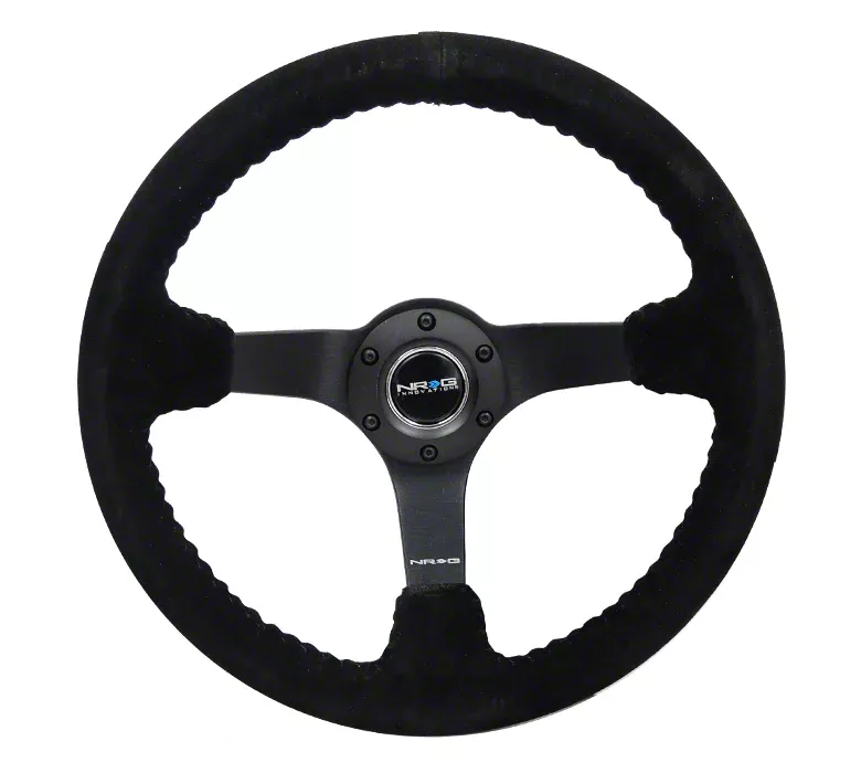 Construction and Appearance. This steering wheel is crafted using high-quality materials, featuring double-rivetted spokes for exceptional strength. The grip area is encased in high-density injection foam for comfort and control, while the Black Suede with Black Stitching design gives it a bold and stylish touch.