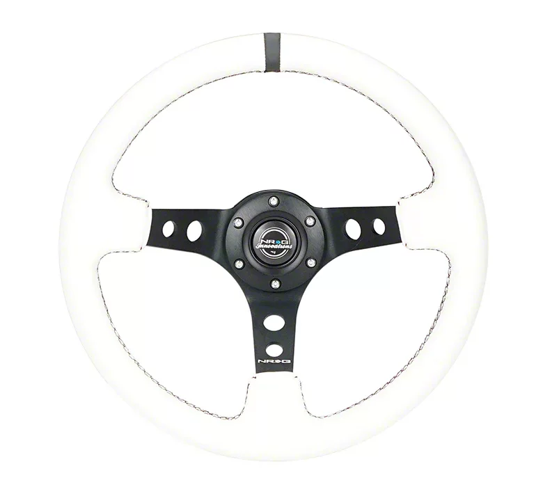 Performance Deep Dish Wheel. The NRG Innovations 350mm 3-Inch Deep Dish Steering Wheel (White Leather with Black Spokes and White Stripes) is designed to offer maximum control and precision during aggressive driving. Perfect for motorsports enthusiasts and street performance drivers, this steering wheel gives you the responsiveness you need while adding a bold aesthetic to your interior.