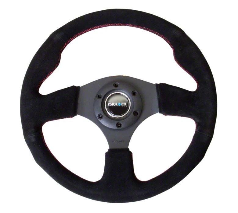 Precision Driving Upgrade. The NRG Innovations 320mm Racing Steering Wheel (Black Suede with Red Stitching) offers drivers a high-performance interface for improved control and road feel. This steering wheel enhances responsiveness during spirited or track driving and gives a sleek, motorsports-inspired aesthetic. Its universal fitment allows it to be installed on a wide range of vehicles with compatible hubs.
