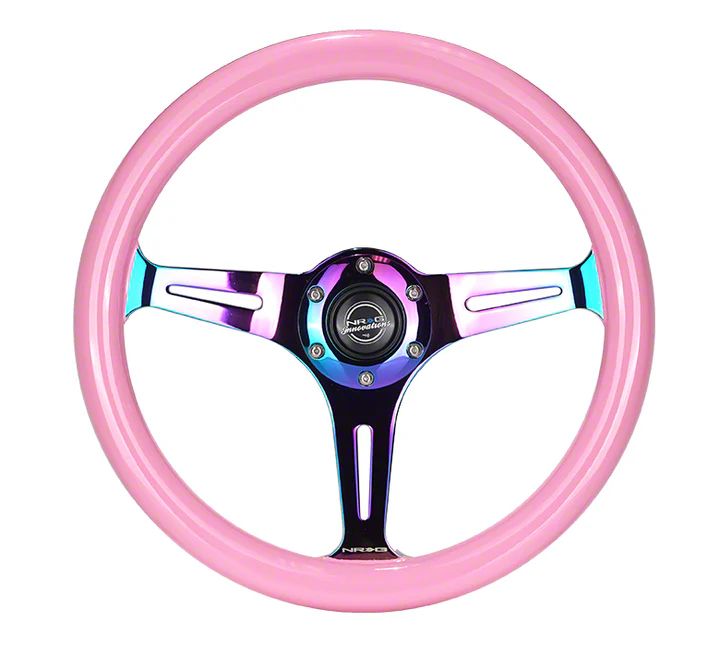 Application. This NRG Innovations Classic Wood Grain 350mm Steering Wheel; Neochrome and Pink fits universal applications; some adaptation may be required.