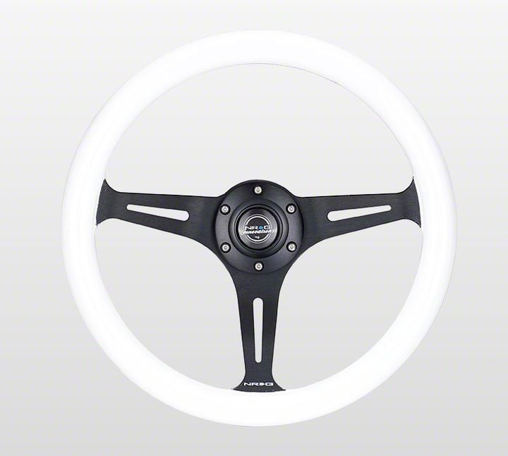 Construction and Appearance. This steering wheel features a high-quality wood grain finish that exudes a timeless appeal, paired with a durable, lightweight aluminum frame for enhanced strength and longevity. The polished black and white design creates a sleek contrast, ensuring a bold yet sophisticated appearance inside your vehicle.