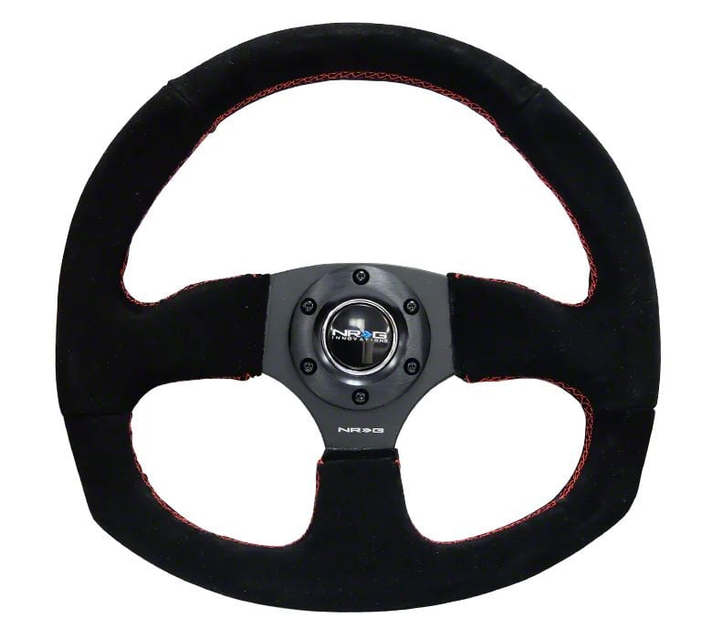 Application. This NRG Innovations Flat Bottom Steering Wheel; Black Suede With Red Stitching, fits universal applications. Some adaptation may be required.