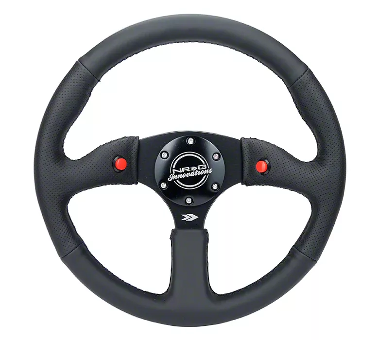 JDM Inspired Steering Wheel. The NRG Innovations 350mm 2-Inch Deep Dual Button Steering Wheel; Black Leather delivers a perfect blend of race and street aesthetics, crafted for drivers seeking both style and performance. This steering wheel is designed to enhance vehicle control and driving experience while maintaining a classic JDM-inspired look.