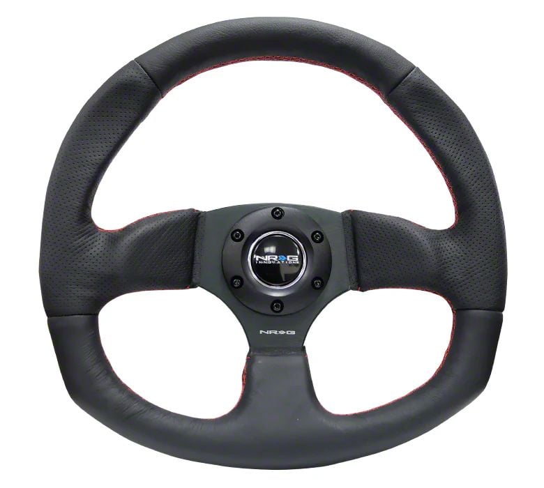 Construction and Appearance. Crafted from lightweight yet reinforced materials, the NRG Innovations Flat Bottom Steering Wheel features double-riveted spokes for increased durability. It’s wrapped in high-quality black leather with contrasting red stitching, providing a sleek, aggressive look that complements any performance interior.