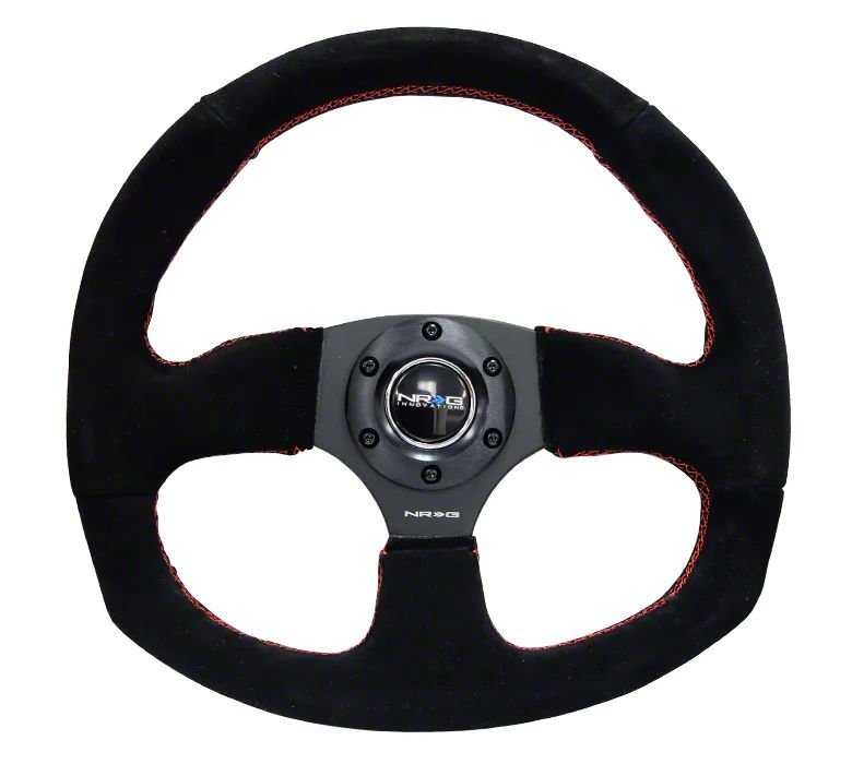 Application. This NRG Innovations Flat Bottom Steering Wheel; Black Suede With Red Stitching fits universal applications. Some adaptation may be required.