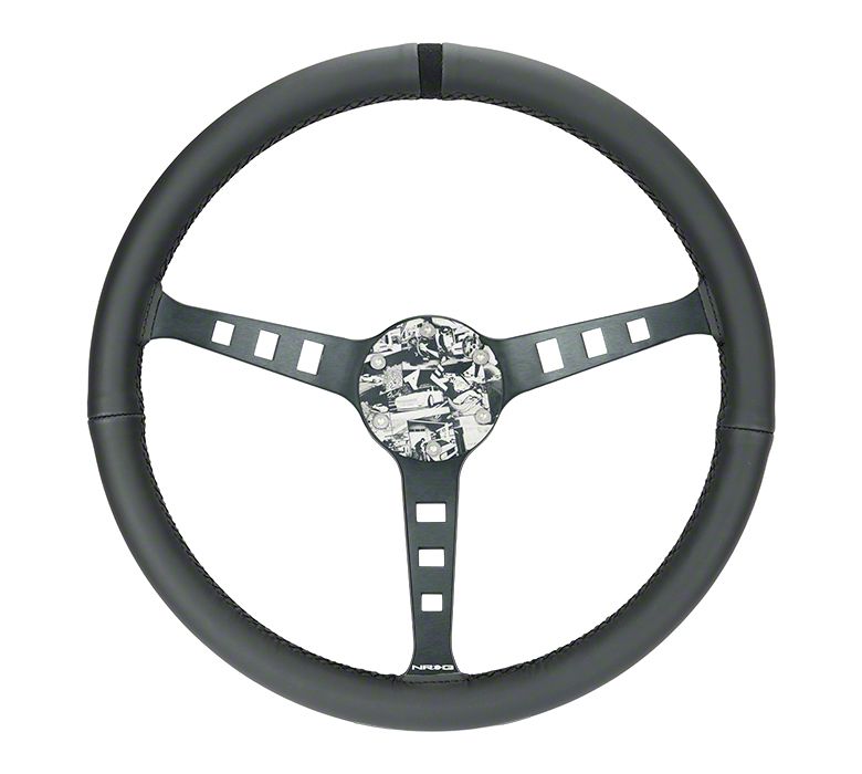 Construction and Appearance. This steering wheel features a premium black leather grip with detailed stitching for a secure and comfortable hold. The anodized spokes provide strength and durability while adding a sleek, performance-inspired look that complements a wide range of interior styles.